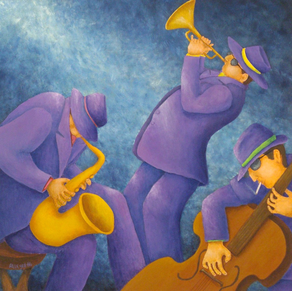 Giclee prints from greeting card size to poster size, tote bags, ornaments, pillows, mugs, masks, etc. of this 20”x20” acrylic on 11/2 thick wrapped canvas are available at: https://fineartamerica.com/featured/cool-jazz-trio-pamela-allegretto.html