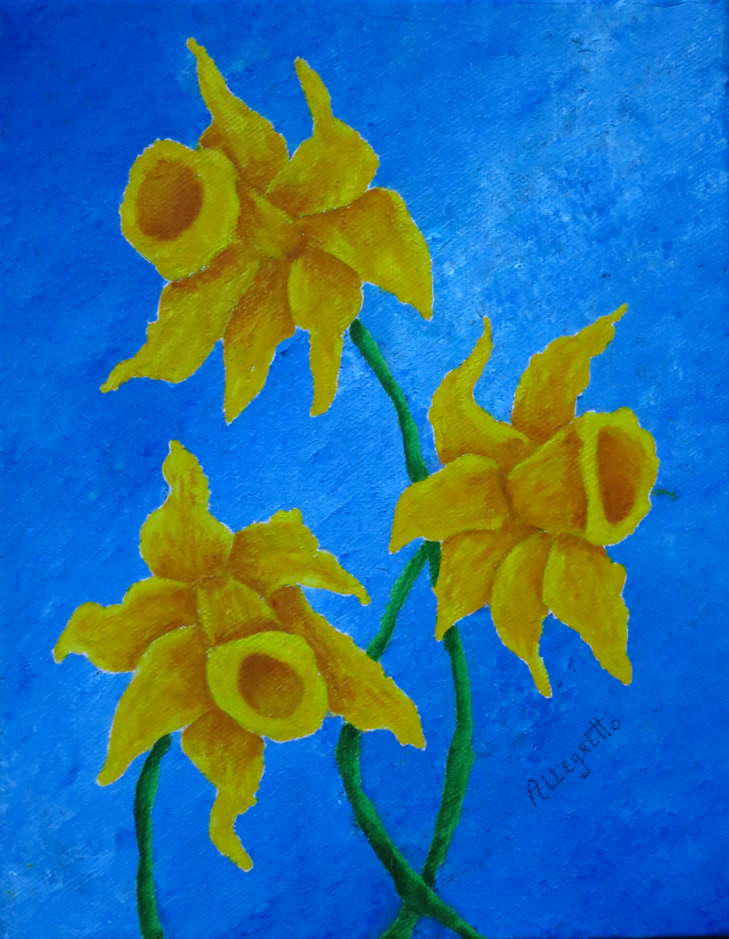 Daffodils are such a happy flower. They are one of the first flowers of Spring. Their shape suggests their trumpeting of a new season awash in color and joy after a long, grey winter. Although clearly I am not a botanical artist, still, I think all flowers are beautiful whether real or imagined. The original 8”x10″ acrylic on wrapped canvas is for sale. Contact me here for details. Quality giclee prints are available at: https://fineartamerica.com/featured/daffodils-for-noni-pamela-allegretto.html
