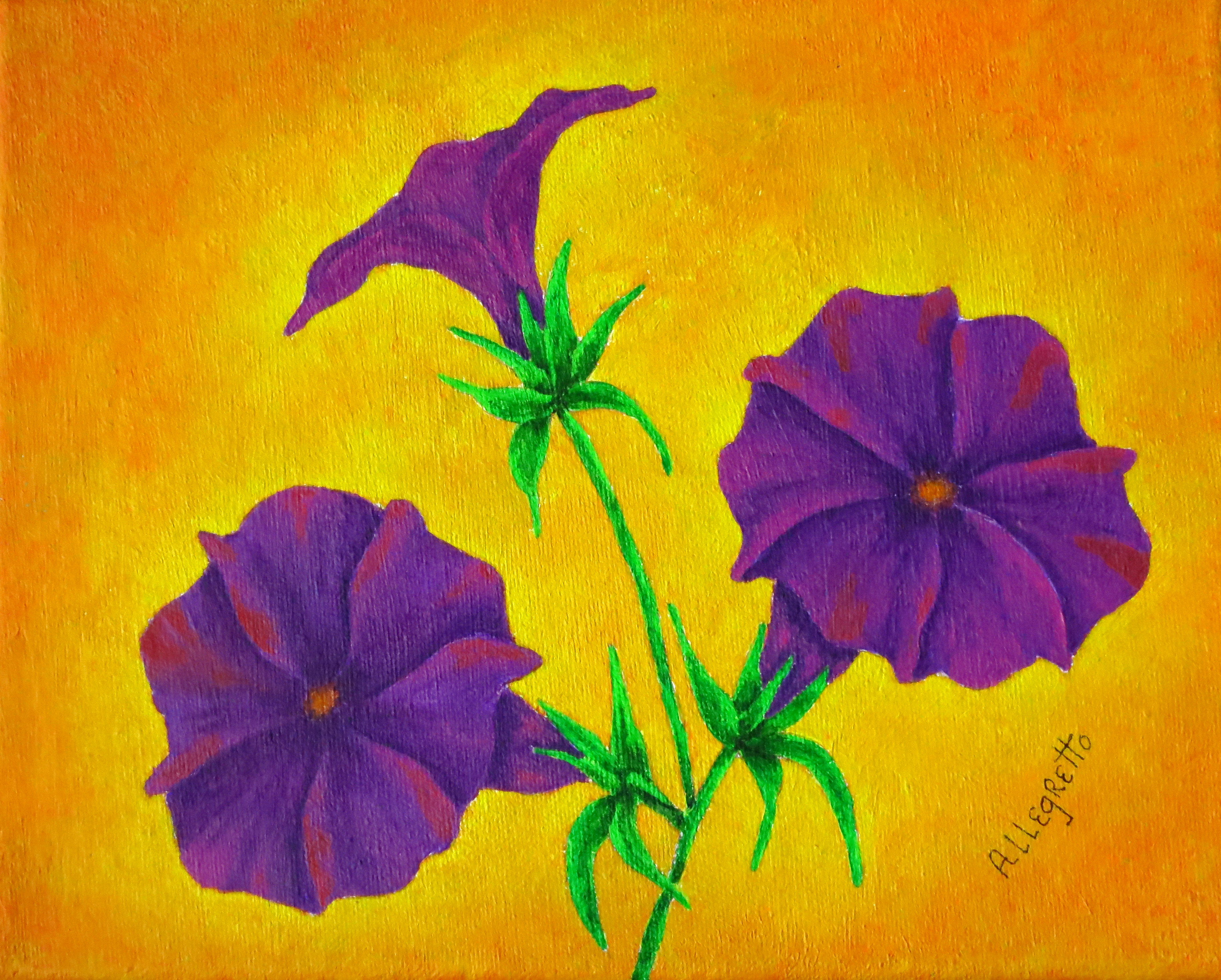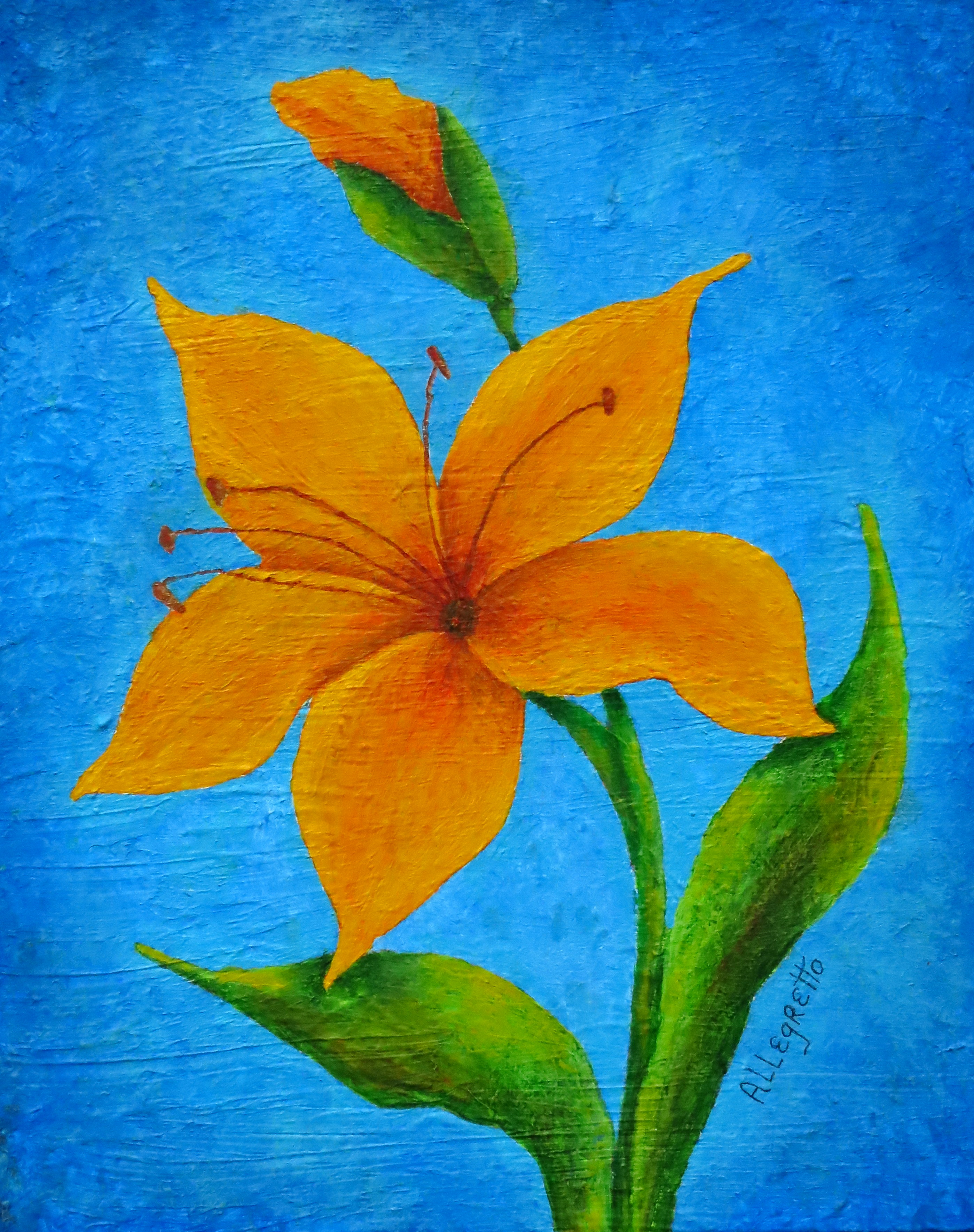 Although the ability to identify most flowers by their proper name eludes me, and my lack of floristic knowledge is often times manifested when for example, I paint rose leaves on a daisy. Still, I like to paint flowers and will continue to do so, be they authentic reproductions or flowers that reside only in my mind’s eye. I think there’s not such thing as an ugly flower, whether real or imagined. Nothing starts a new day better than when Day Lilies open their petals to a new sunrise. The original 8″x10″ acrylic on wrapped canvas is available on my artist website: https://www.pamelaallegretto-franz.comhttp://www.pamelaallegretto-franz.com Quality Giclee prints from greeting card size to poster size are available for purchase on my Fineartamerica site: https://fineartamerica.com/featured/orange-day-lily-at-dawn-pamela-allegretto.html