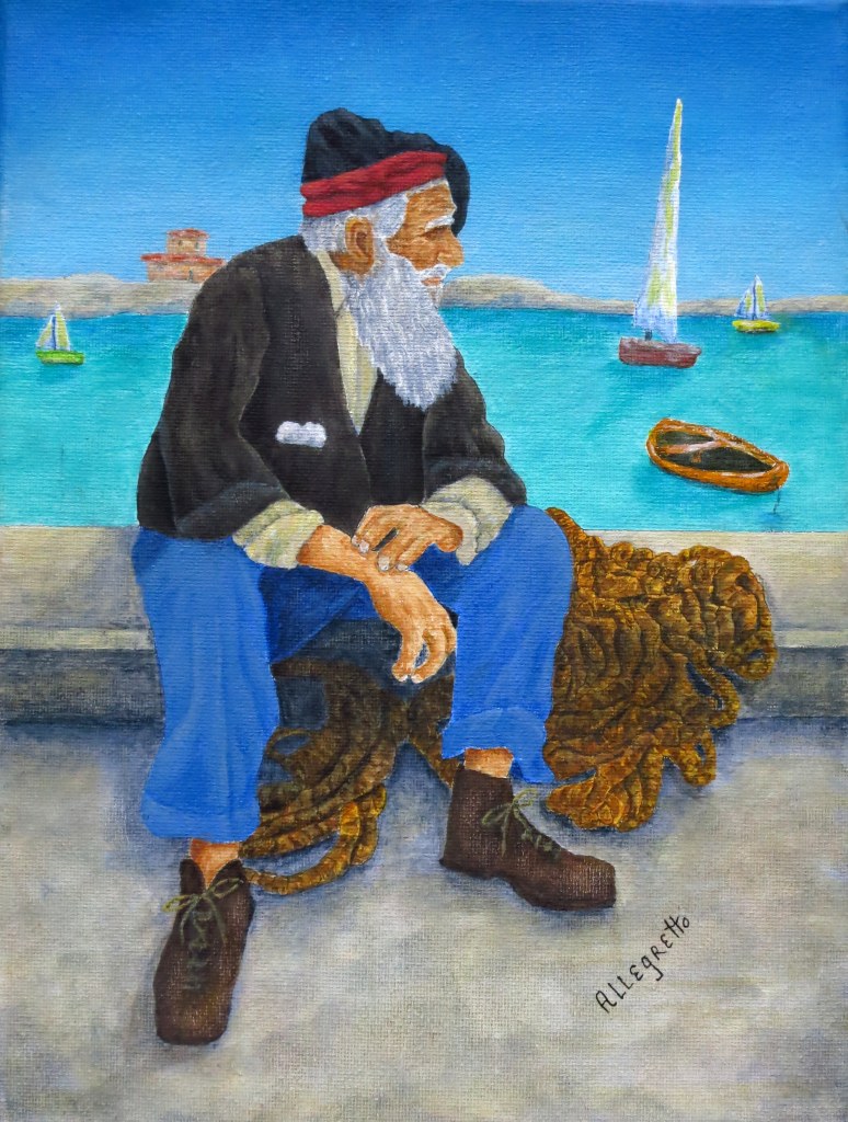Nostalgic caricature of an aged Italian Fisherman daydreaming in the midday Neapolitan sun, contemplating his morning catch. He is accompanied by a large, coiled rope beside him, while colorful sailboats and a clear blue sea provide a serene backdrop.